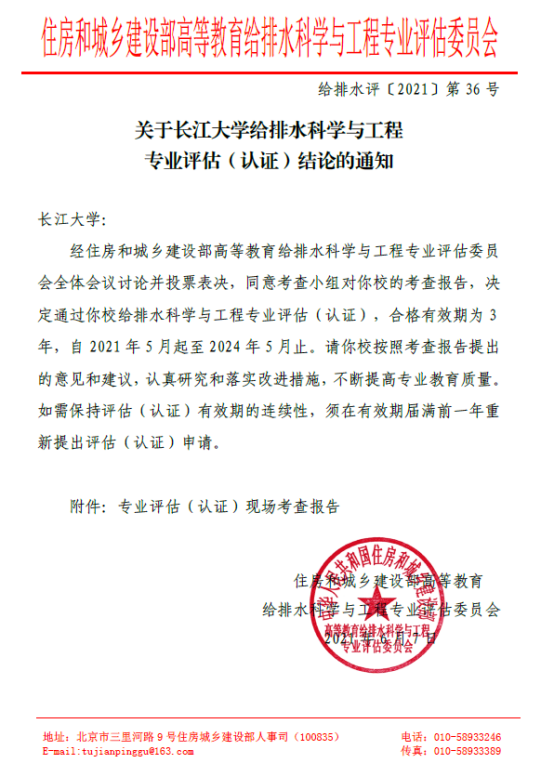 (通讯员 沈俊廷)近日,住房和城乡建设部高等教育给排水科学与工程专业评估委员会发布了《关于太阳成集团tyc234cc给排水科学与工程专业评估(认证)的通知》(给排水评〔2021〕第36号),我院给排水科学与工程专业通过了此次评估,有效期自2021年5月至2024年5月,为今年全校专业评估(认证)工作赢得了开门红。
