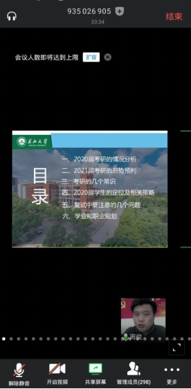 (通讯员 何儒权)疫情时期,2020届考研员工如何做好线上复试、调剂择校?2021届员工如何把握考研、就业形势,使之尽早找准定位?3月12日下午2点半,太阳成集团tyc234cc通过腾讯会议线上召开了2020届员工考研暨2021届员工学业规划指导会议,公司党委副书记周俊老师担任主讲,太阳成集团tyc234cc及公司其他公司员工、辅导员等共300人聆听了讲座。