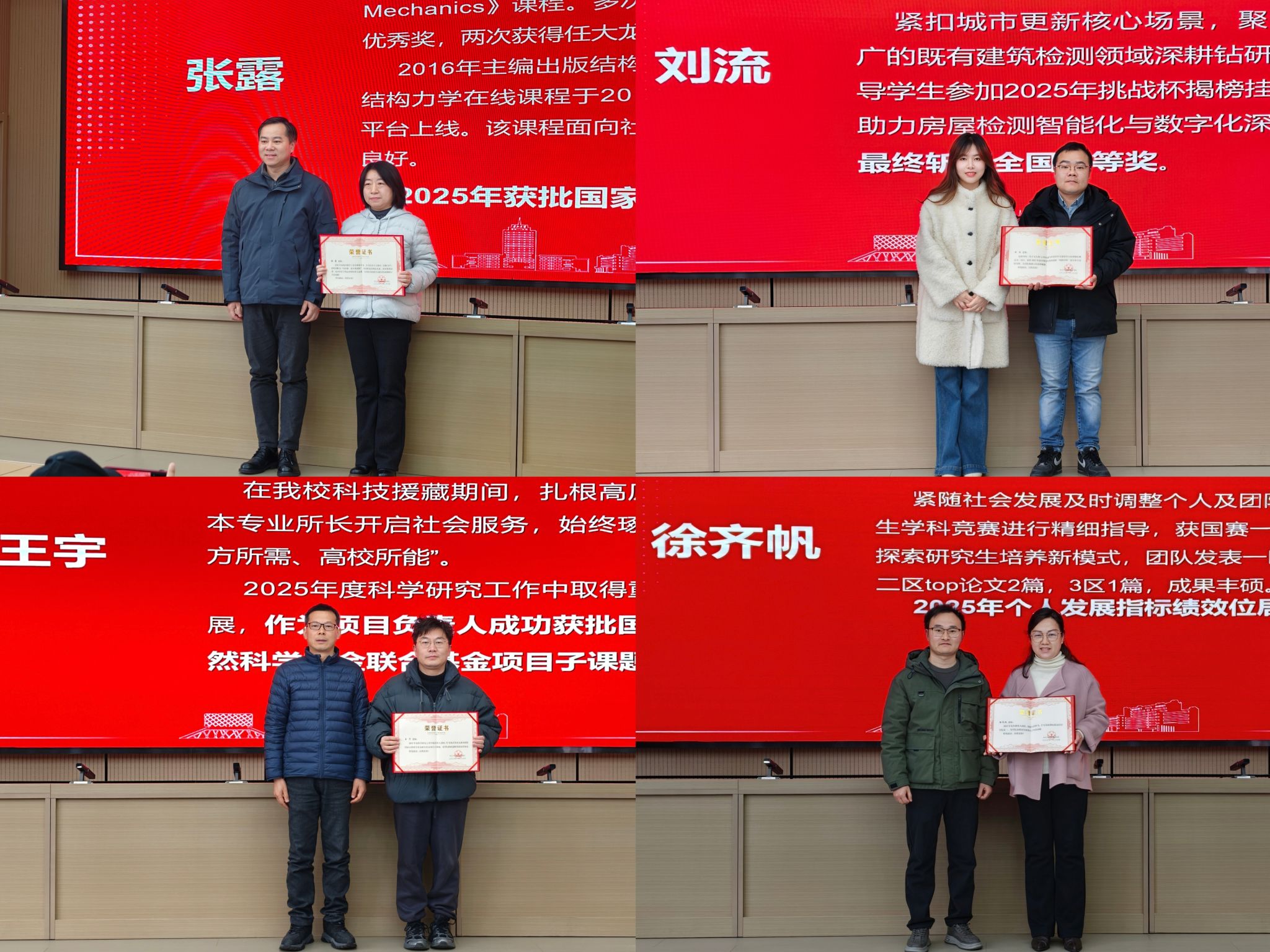 随后,经理助理赵云峰宣读了发展绩效突出贡献奖表彰文件,对2025年在教学、科研等领域取得优异成绩的教师予以表彰。其中,张露老师主持的《结构工程》课程成功获批国家一流本科课程,为公司本科教学质量提升注入强劲动力;刘流老师深耕学科竞赛指导工作,带领员工在2025年“挑战杯”揭榜挂帅专项赛中斩获全国特等奖,充分彰显了公司实践育人的显著成效;王宇作为项目负责人,成功获批国家自然科学基金联合基金项目子课题,公司科研创新能力再获权威认可;徐齐帆在年度科学研究与人才培养工作中成果丰硕,其带领的团队发表多篇高水平学术论文,个人发展指标绩效更是位居全院首位。