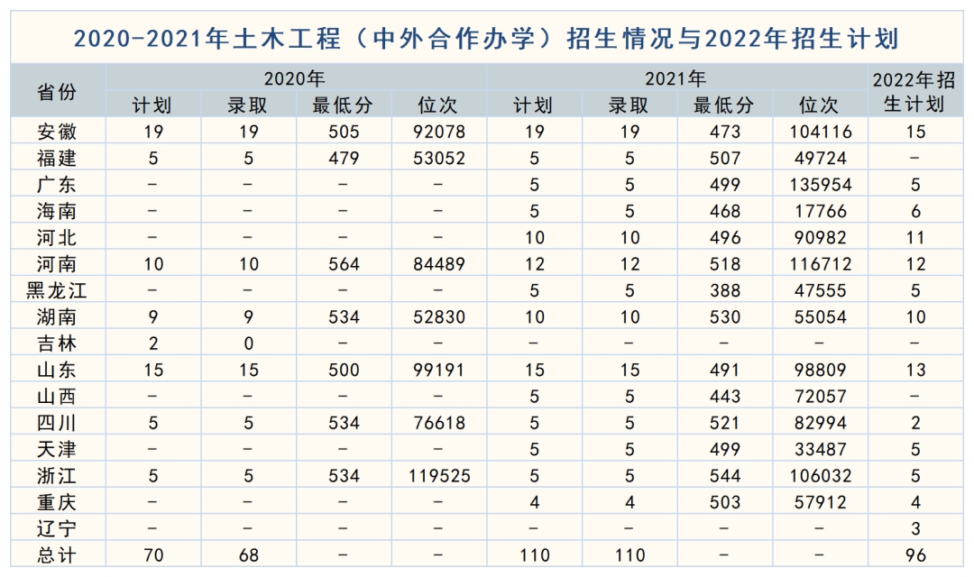 ※ 2022年,土木工程中外合作办学项目在天津、河北、辽宁、黑龙江、浙江、安徽、山东、河南、湖南、广东、海南、重庆、四川13个省(市、区)共计招生96名,历年招生情况和2022年分省招生计划数详见下表。