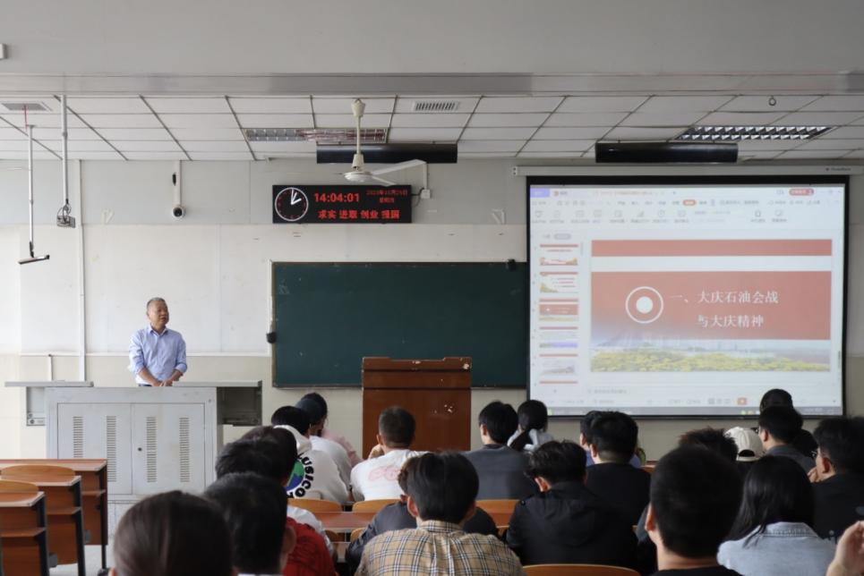 中国石油工业的发展,一个又一个的辉煌都是在“苦干实干”的基石上拼搏而来。“有条件要上,没有条件创造条件也要上”,在讲到铁人王进喜甘于吃苦、直面困难的事迹时,叶经理鼓励同学们要发扬“学铁人、做铁人”的精神,加大科研攻关力度,增强干事创业敢担当的本领,扎根人民,奉献国家,做新时代的“脊梁”。