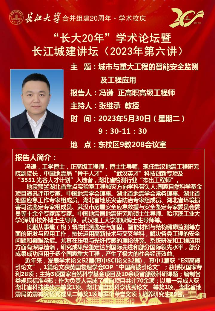 “长大20年”学术论坛暨长江城建讲坛(2023年第六讲):城市与重大工程的智能安全监测及工程应用