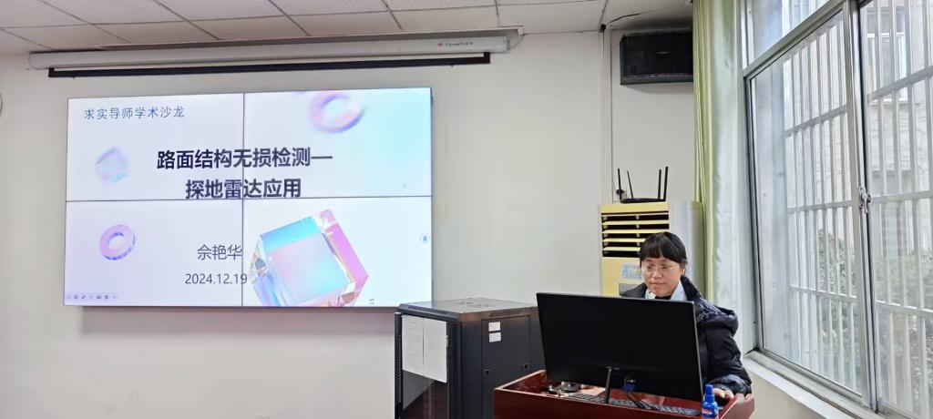 硕士生导师佘艳华副教授作题为“路面结构无损检测技术”的学术报告。介绍了图像、频谱、激光、雷达技术在路面无损检测中的应用概况,对探地雷达技术的原理、组成及性能指标进行了详细讲解,重点分析了探地雷达在路面脱空检测、路面基层厚度检测、路面裂缝检测等方面的信号数据特点。