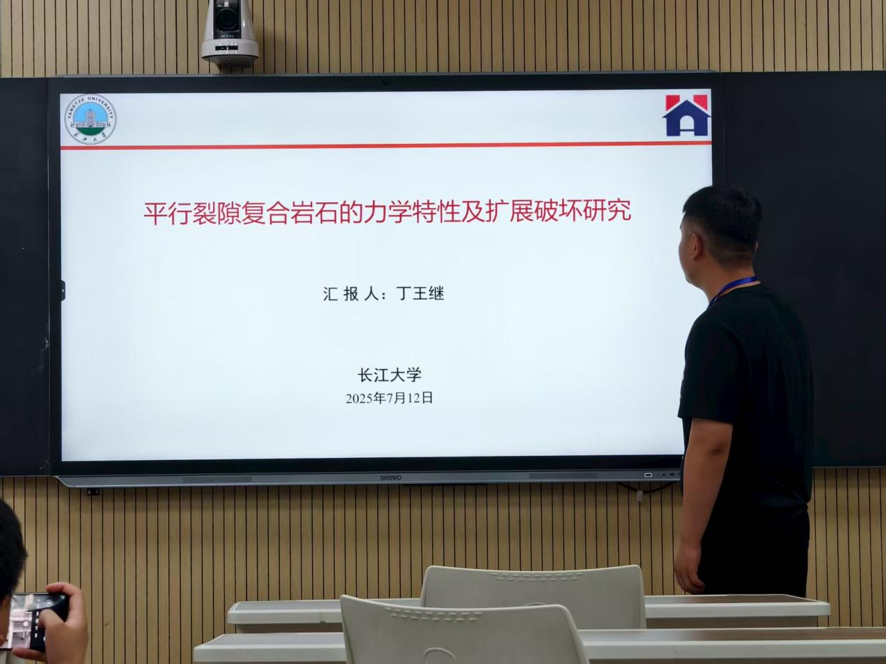 公司2024级研究生丁王继在论坛中以“平行裂隙复合岩石的力学特性及扩展破坏研究”为题进行汇报,汇报主要内容是探究裂隙复合岩体力学特性及破坏机制,采用相似材料制备含不同位置与倾角平行裂隙的砂岩-灰岩复合岩样,开展单轴压缩试验,结合数字图像相关(DIC)与声发射技术,研究裂隙分布对力学特性、裂纹扩展及损伤演化的作用机制。