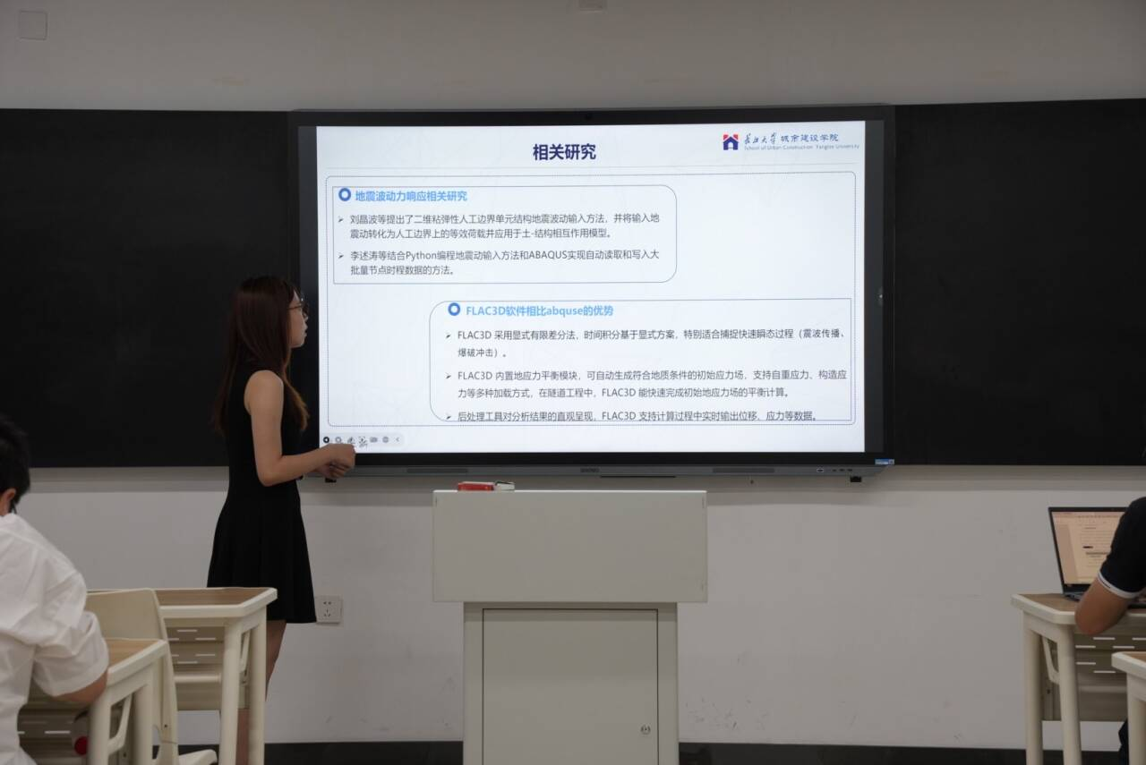 公司2023级研究生孙睿哲在论坛中以“SV波和P波作用下隧道动力响应特征研究”为主题进行了汇报,内容主要聚焦于结合 FLAC3D 与 MATLAB 软件,研究地震波斜入射下隧道动应力响应的分析方法。通过理论软件结合揭示不同地震动参数下SV波和P波的传播规律及其对地下隧道的动力响应机制,旨在准确评估地震荷载对隧道结构的损伤效应,同时为提升城市地下空间抗震能力提供理论支撑与技术参考。