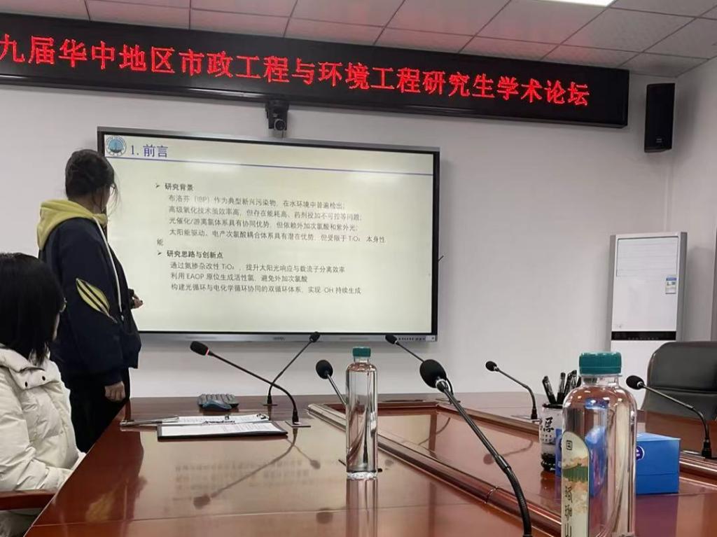 2024级研究生汪亚琴作题为“太阳能活化N-TiO₂催化电产次氯酸盐体系中布洛芬的降解:协同机制、自由基循环与微生物效应”的分享汇报,探讨太阳能驱动下光催化与电化学产次氯酸盐协同降解药物污染物的机制与效应,为构建绿色高效水处理技术提供实验依据。