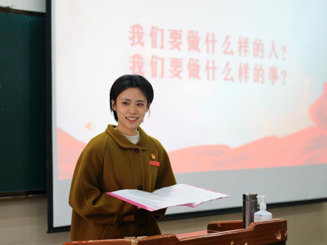 接下来,本次活动的主讲人马艺文以《躬耕教坛,强国有我》为主题,从袁辉先生的理想信念、躬耕态度、仁爱之心、弘道追求六个方面对“教育家精神”进行剖析和分享,还结合自己在支教期间的经历和感受,深入阐述了“教育家精神”对于国家的重要性以及作为一名教育工作者所应具备的品质。整个宣讲过程中,马艺文的讲解深入浅出,语言生动有力,赢得了在座同学们的阵阵掌声。
