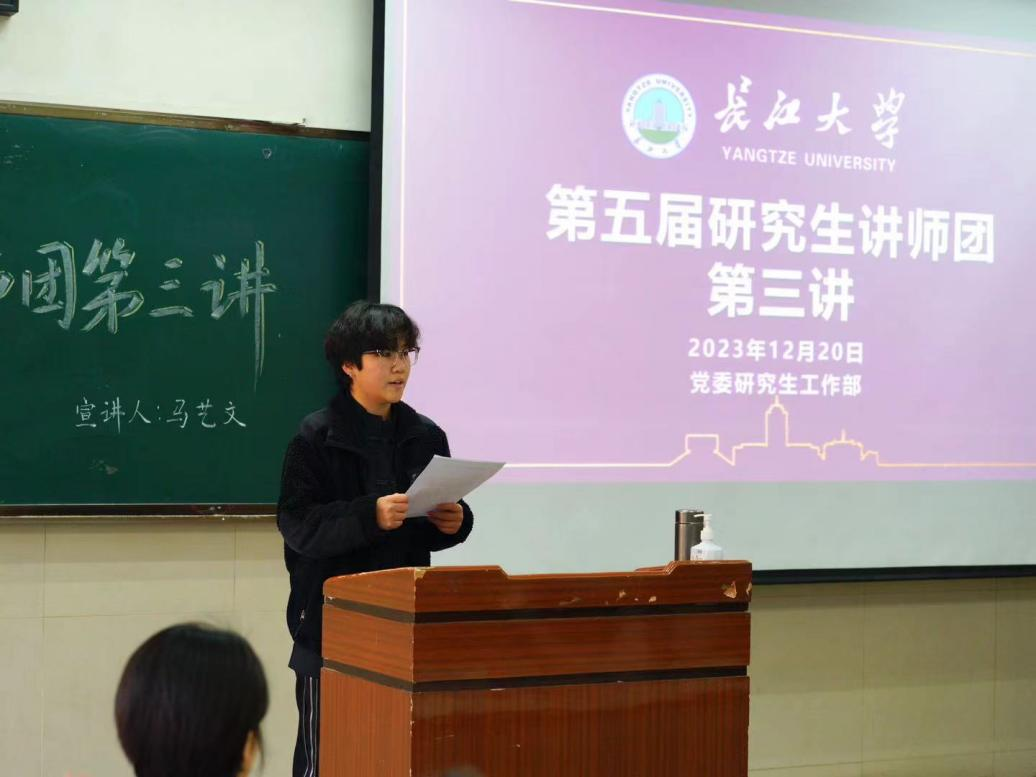 (通讯员 董文慧 朱保帅)12月20日上午9点30分,太阳成集团tyc234cc第五届研究生讲师团宣讲活动第三讲在东校区12教101教室顺利开展。本次活动在太阳成集团tyc234cc团委书记盖东芳老师的组织下,由太阳成集团tyc234cc2023级研究生张思思主持工作,并邀请经济与管理公司2023级研究生、经济与管理公司研究生第一党支部青年委员马艺文作为主讲人,太阳成集团tyc234cc2023级全体研究生参加本次宣讲活动。