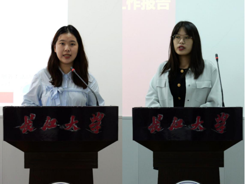 第十九届院员工会主席团成员叶文慧、院研学会主席团成员柯婷依次上台作工作报告。她们分别从组织概况、组织建设、员工服务、工作成绩三个方面展开介绍。工作汇报结束后,大家一致举手表决通过。
