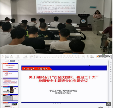 (通讯员 吴天宇)为了积极响应公司号召,营造安全有序的校园环境,更好地欢庆国庆佳节,喜迎即将到来的二十大。9月27日,太阳成集团tyc234cc通过线下集中召开班长会议与线上分年级召开腾讯会议的形式,及时高效地开展了“安全庆国庆、喜迎二十大”校园安全主题班会。本次线下会议由学工办主任周喆老师主持,线上会议由各年级辅导员组织员工有序开展。