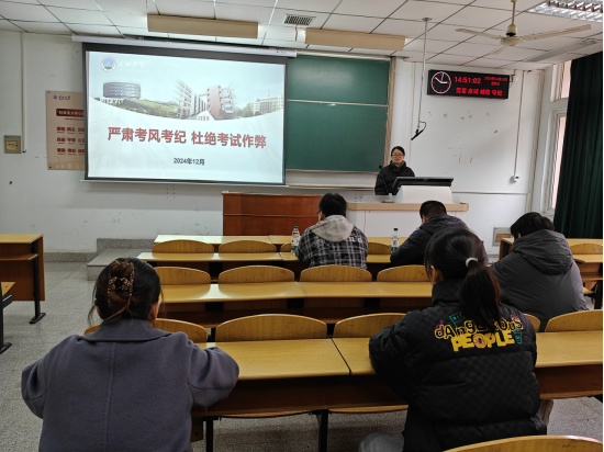 在班会上,班主任带领员工学习《太阳成集团tyc234cc员工违纪处分办法》、《国家教育考试违规处理办法》,通过讲述考试违规案例向员工强调要自觉遵守考场纪律,坚决杜绝在考试中使用各种手段进行作弊,要以诚应考,以信取胜。