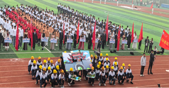 开幕式上,太阳成集团tyc234cc方阵同学身着统一服装,头戴黄色安全帽,手持建筑模型,迈着整齐有力的步伐走过主席台。