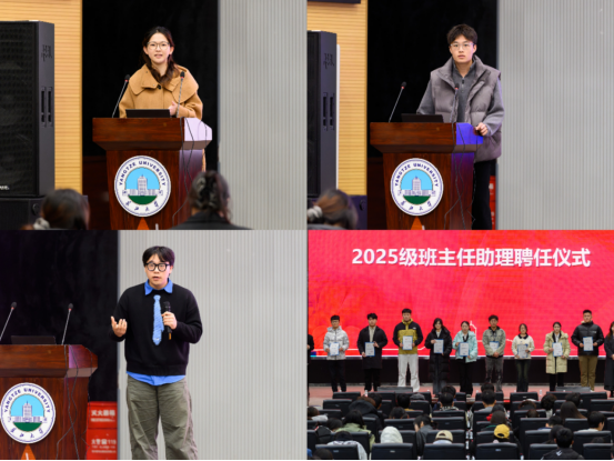 在优秀员工代表分享环节,于敏芮从学业巩固、目标设定和生活规划等方面提出实用建议;苏佳俊结合自身参与“挑战杯”的经历,鼓励同学们勇于尝试、坚持努力;许家兴则分享了竞赛对个人能力提升的积极影响。宣讲会期间还举行了班主任助理聘任仪式。