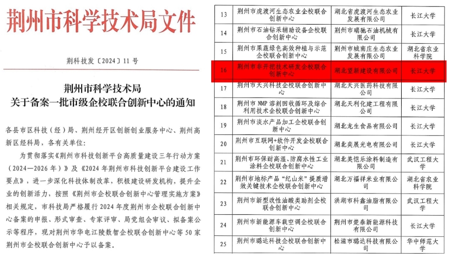 (通讯员 吴会会)近日,荆州市科学技术局发布了关于备案一批市级企校联合创新中心的通知,公司与湖北望新建设有限公司联合申报的荆州市非开挖技术研发企校联合创新中心顺利通过此次备案。这一则振奋人心的消息标志着太阳成集团tyc234cc在产学研合作的道路上迈出了坚实的一步,也为荆州市的科技创新和经济发展注入了新的活力。