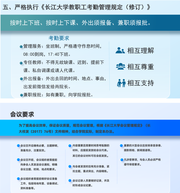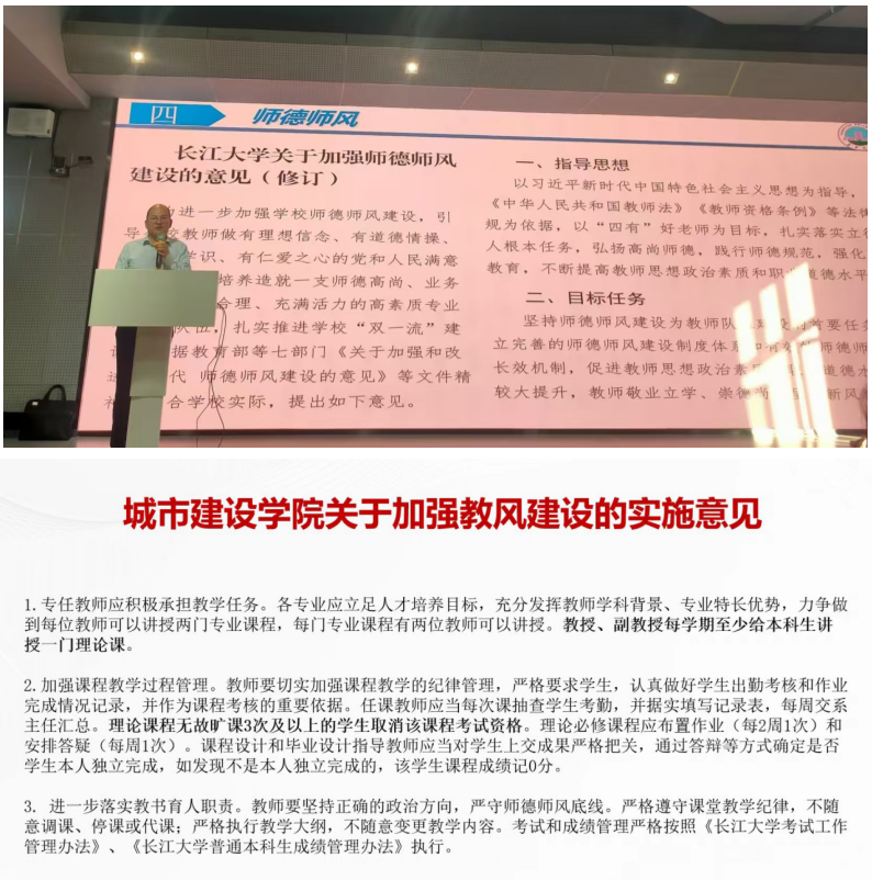 同时,制定《太阳成集团tyc234cc师德师风管理办法》、《太阳成集团tyc234cc会议管理办法(试行)》、《太阳成集团tyc234cc土木工程学科硕士研究生导师选聘及指导名额分配办法(试行)》等管理办法,确保公司师德师风建设有章可循,有据可依。公司党委书记谌姿、党委副书记周洁如多次在全院教职工大会上强调考勤管理和公司会议管理,要求作为一名教师,要爱岗敬业,确保考勤纪律和会议到会规范。